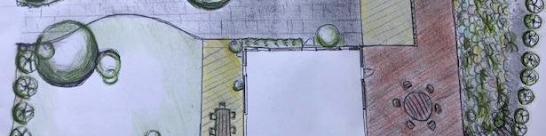 Planung größerer Gartenbereiche mit detaillierten, nahezu maßstabgetreuen Skizzen.